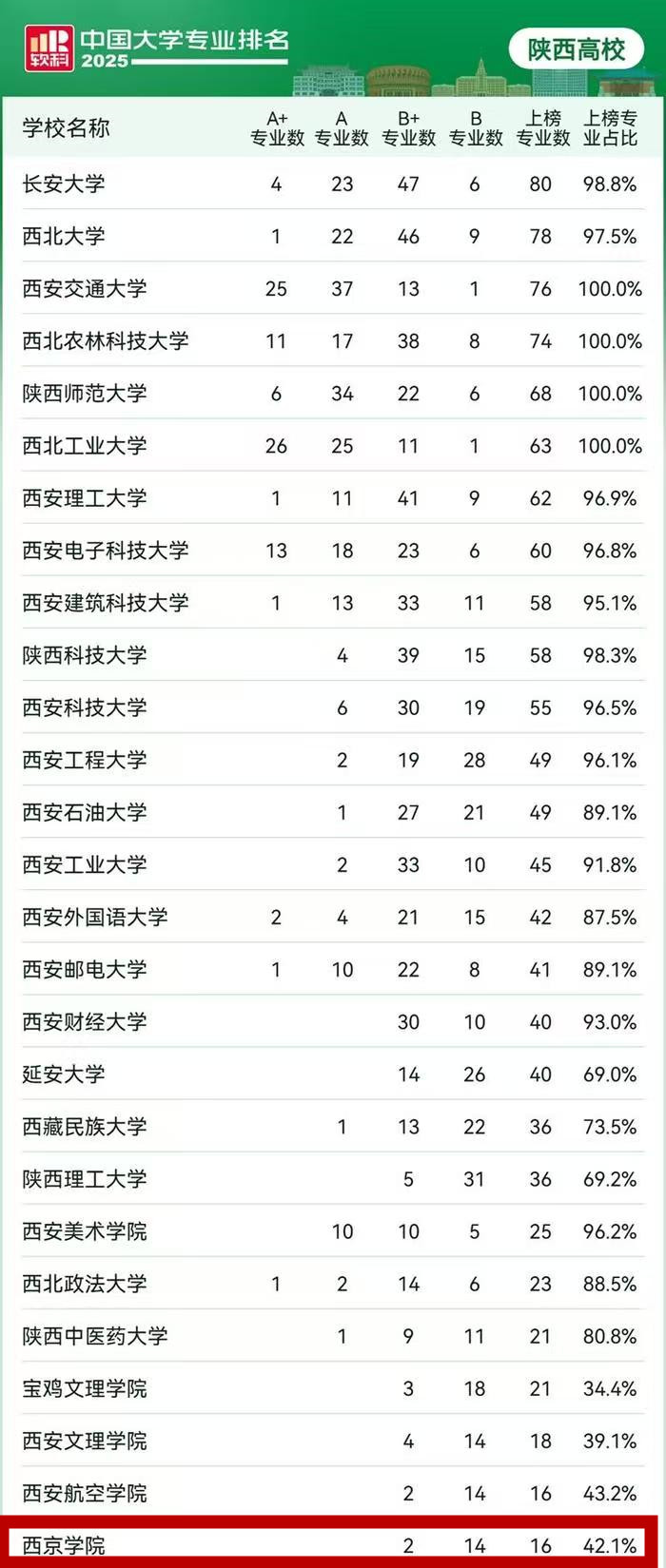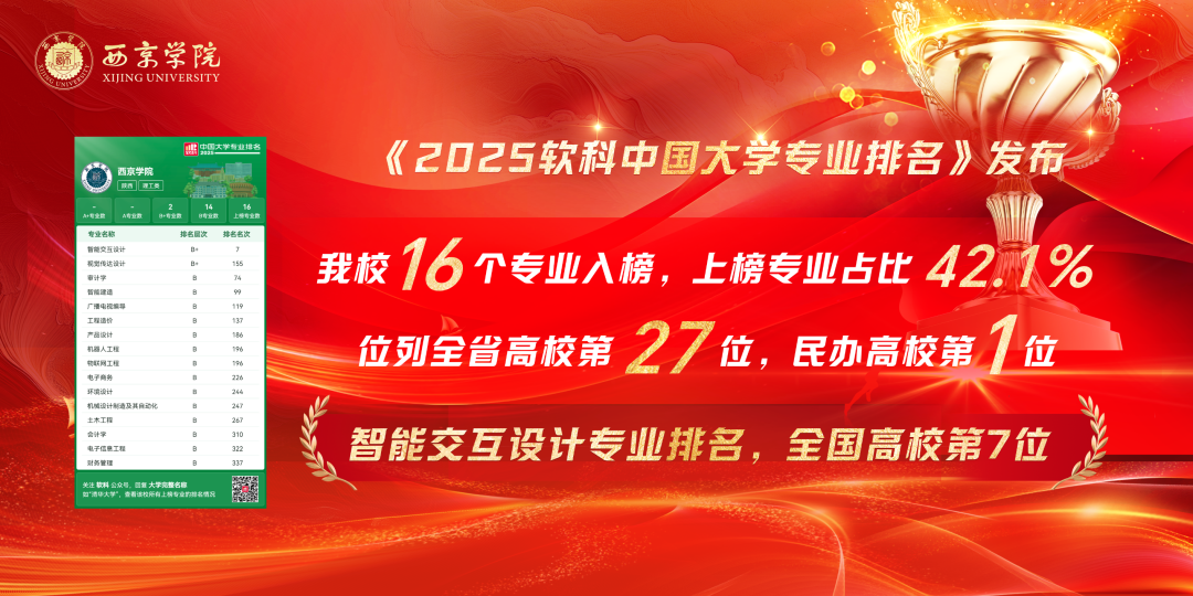 2025年6月18日,高等教育专业评价机构软科正式发布“2025软科中国大学专业排名”,西京学院16个专业上榜,上榜专业占比42.1%,上榜总数位列陕西省高校第27位、陕西省民办高校第1位。其中,智能交互设计专业排名全国高校第7位。