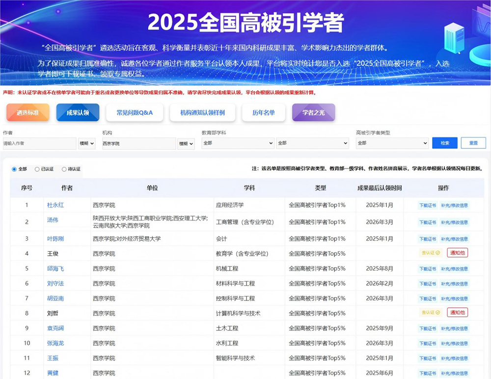 中国科学文献计量评价研究中心近日发布“2025全国高被引学者”榜单,我校12位学者入选。